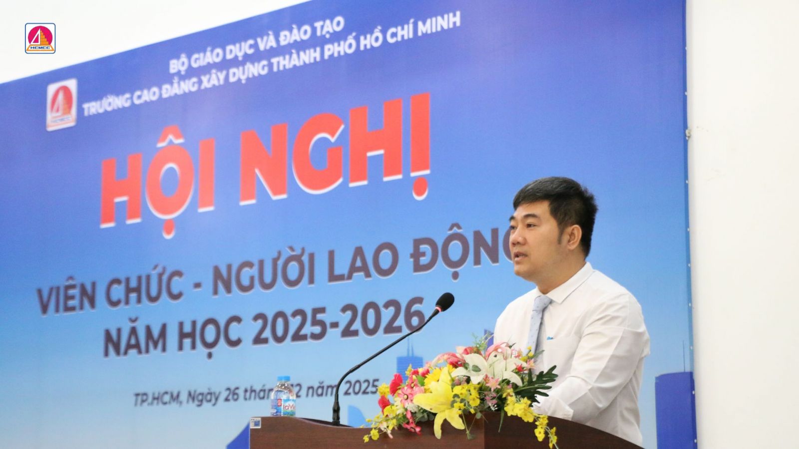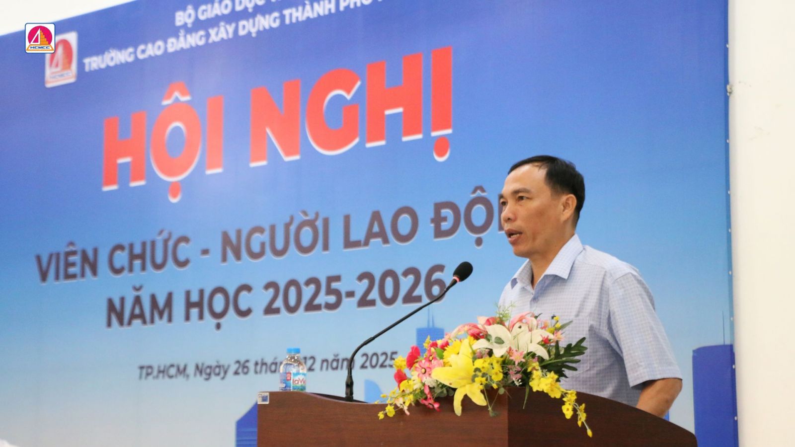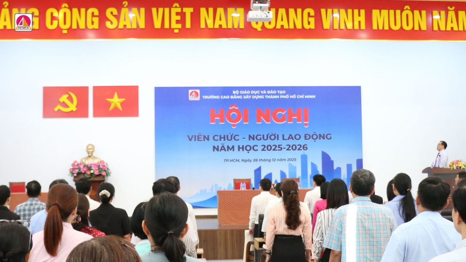 Sáng ngày 26/12/2025, tại Hội trường tòa D, Trường Cao đẳng Xây dựng TP. HCM “Hội nghị Viên chức, Người lao động năm học 2025 - 2026” đã được tổ chức với sự tham gia đầy đủ của toàn thể cán bộ, viên chức và người lao động của Nhà trường. Hội nghị không chỉ là cơ hội tổng kết hoạt động trong năm học vừa qua, mà còn là diễn đàn để mọi thành viên trong trường cùng nhau đóng góp ý kiến, thống nhất mục tiêu phát triển trong năm học mới.