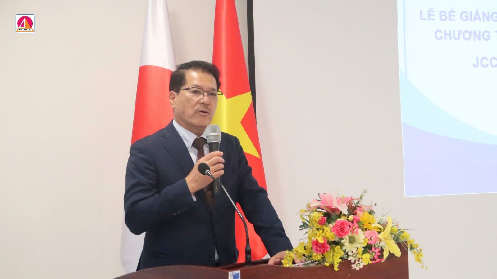Ông HAMAMURA TETSUNOSHIN, Tổng Giám đốc công ty Earth Vietnam Construction Consultants (EVCC), đã có bài phát biểu quan trọng. Ông báo cáo tình hình hiện tại của các khóa học JCC05, nhấn mạnh sự nỗ lực của các học viên trong suốt quá trình học tập. Ông cũng chia sẻ rằng các em học viên khóa JCC05 đã hoàn thành chương trình học với nhiều thành tựu ấn tượng, tạo nền tảng cho tương lai.