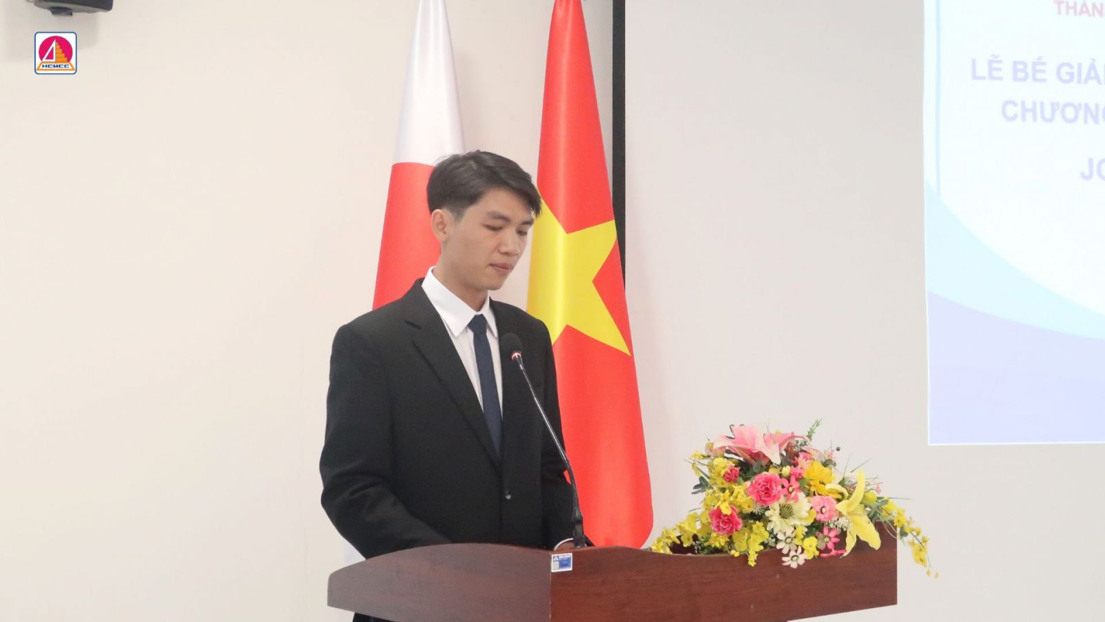 Đại diện cho các học viên mới của khóa JCC05, bạn Đại Dương Tùng đã có phần phát biểu đầy quyết tâm. Trong lời phát biểu, anh bày tỏ lòng biết ơn đến nhà trường và công ty Earth Vietnam Construction Consultants vì đã mang đến cơ hội học tập quý báu. Học viên Đại Dương Tùng thay mặt các học viên cam kết sẽ nỗ lực học tập để lĩnh hội tốt nhất những kiến thức về công nghệ xây dựng Nhật Bản.