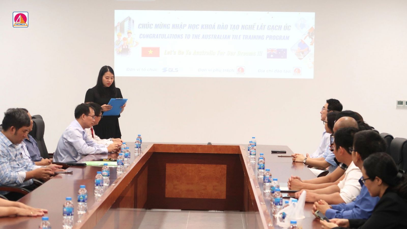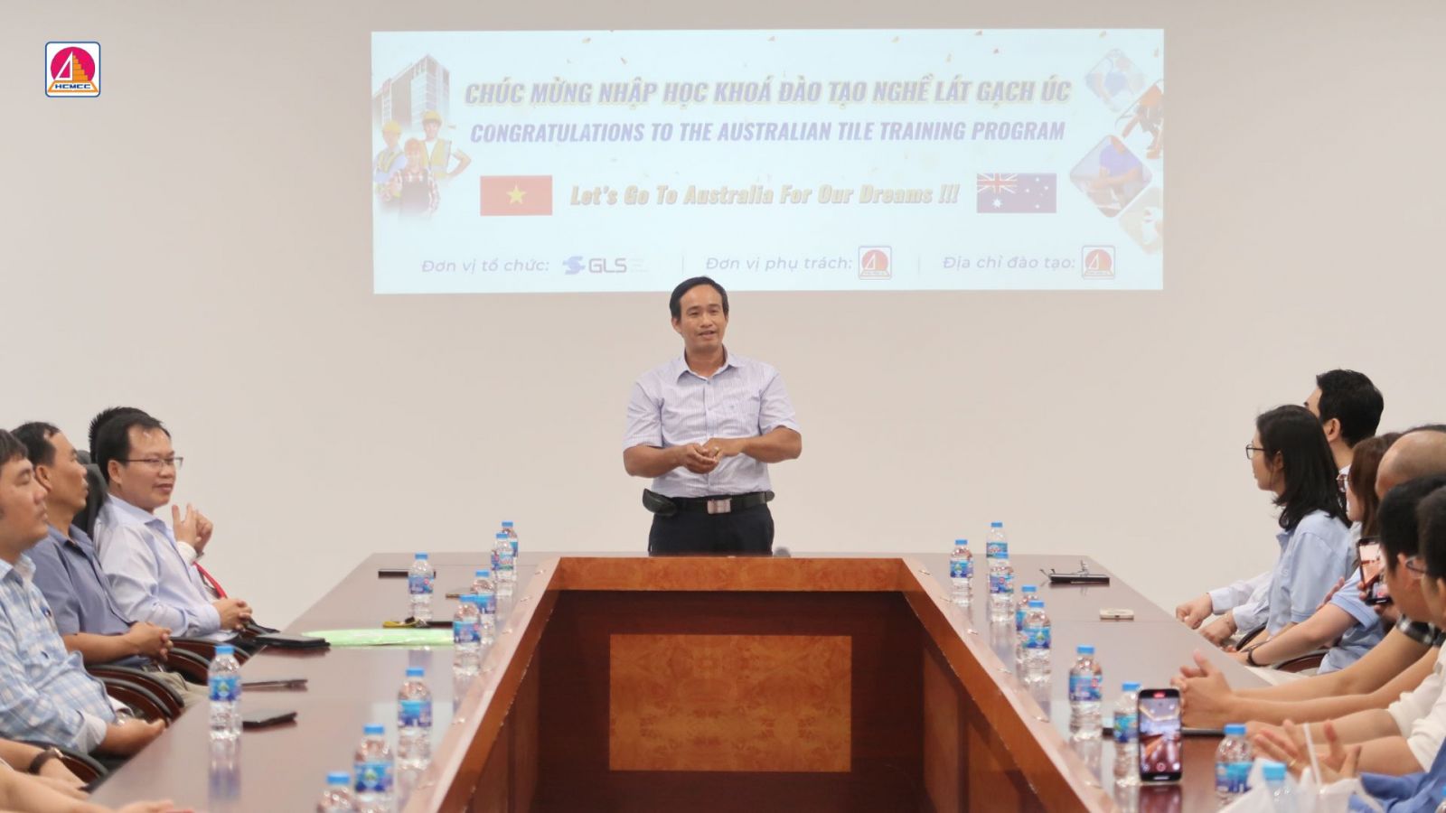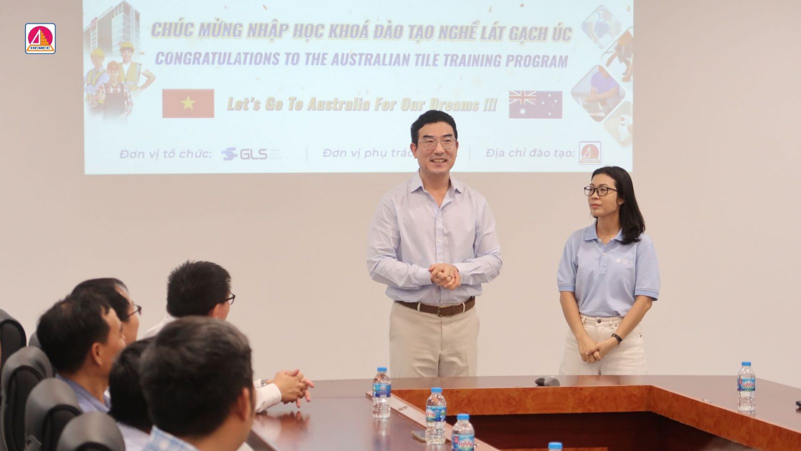 Buổi lễ vinh dự đón tiếp sự hiện diện của các đại biểu đến từ Nhà trường và đơn vị hợp tác. Ông CHOI JOO YOUNG - Tổng Giám đốc Công ty TNHH Global Labor Solution (đại diện phía doanh nghiệp); Thầy Nguyễn Bá Khiêm - Hiệu trưởng Trường Cao đẳng Xây dựng TP. Hồ Chí Minh; Thầy Lê Khắc Toản - Phó Hiệu trưởng Nhà trường; Thầy Dương Công Đức - Trưởng phòng Đào tạo; cùng quý thầy cô các phòng, ban, trung tâm và toàn thể học viên lớp Đào tạo nghề lát gạch Úc năm 2025.