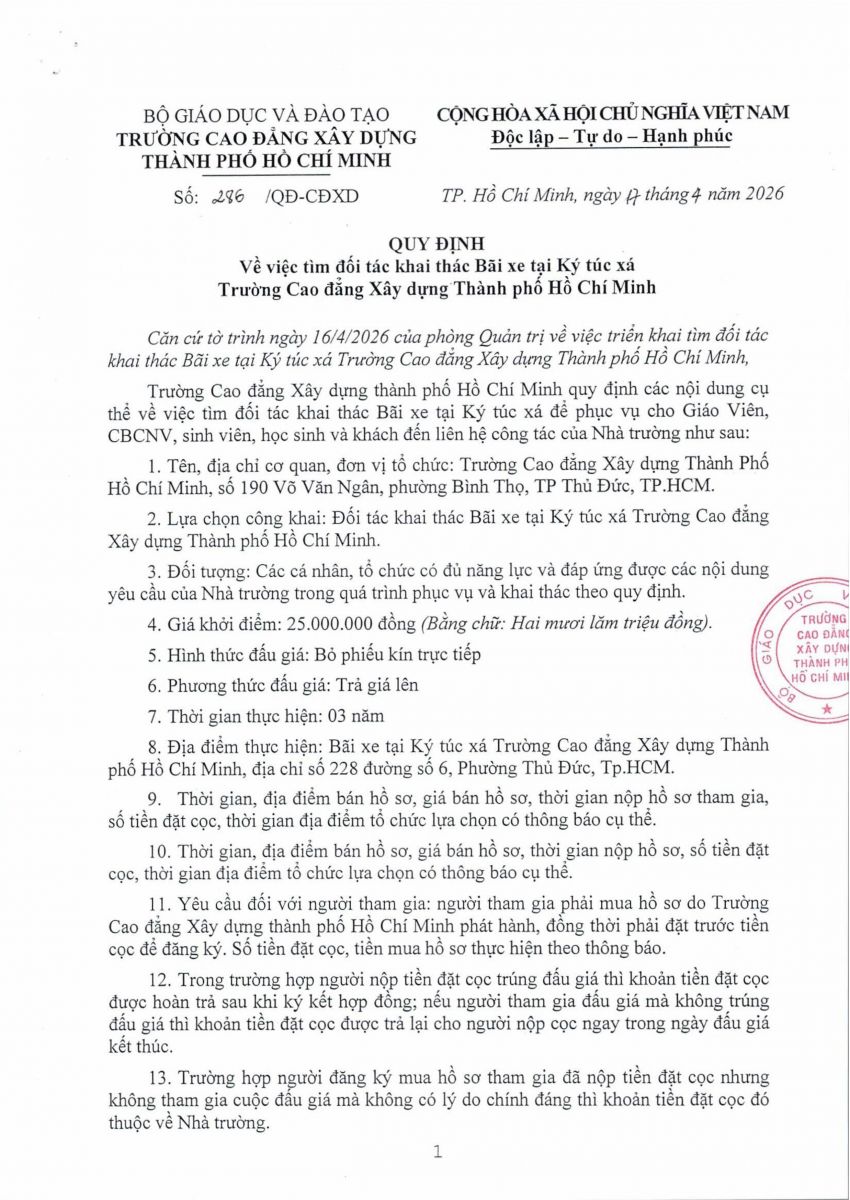 > Quy Định Vv Tìm Đối Tác Khai Thác Bãi Xe Tại Ký Túc Xá Trường Cao Đẳng Xây Dựng TP. HCM