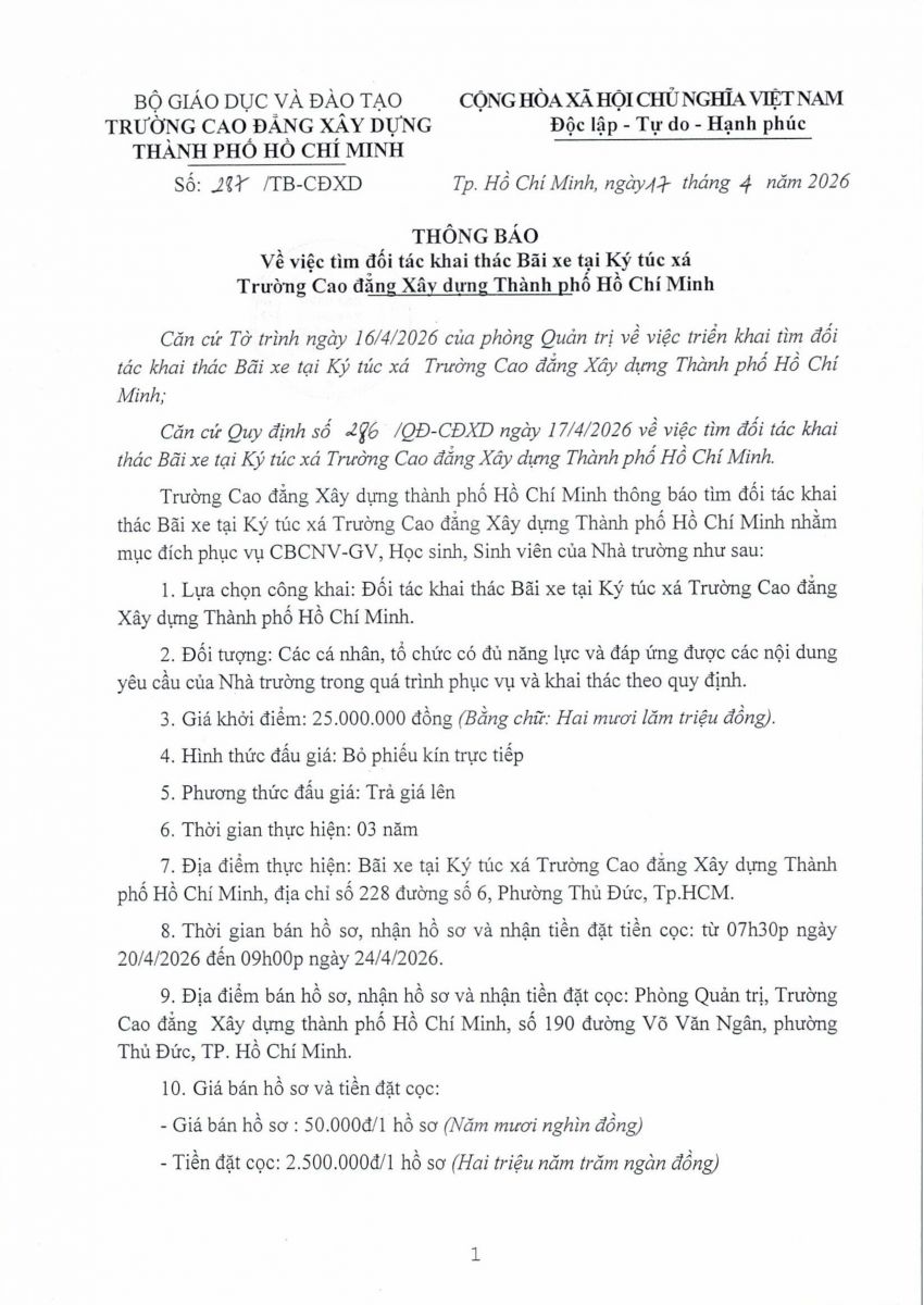 Thông Báo Vv Tìm Đối Tác Khai Thác Bãi Xe Tại Ký Túc Xá Trường Cao Đẳng Xây Dựng TP. HCM