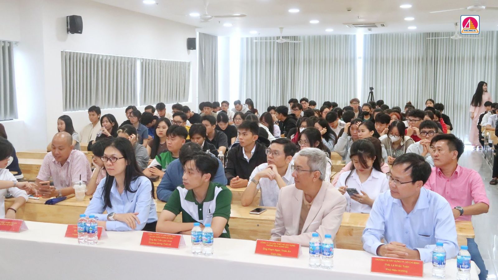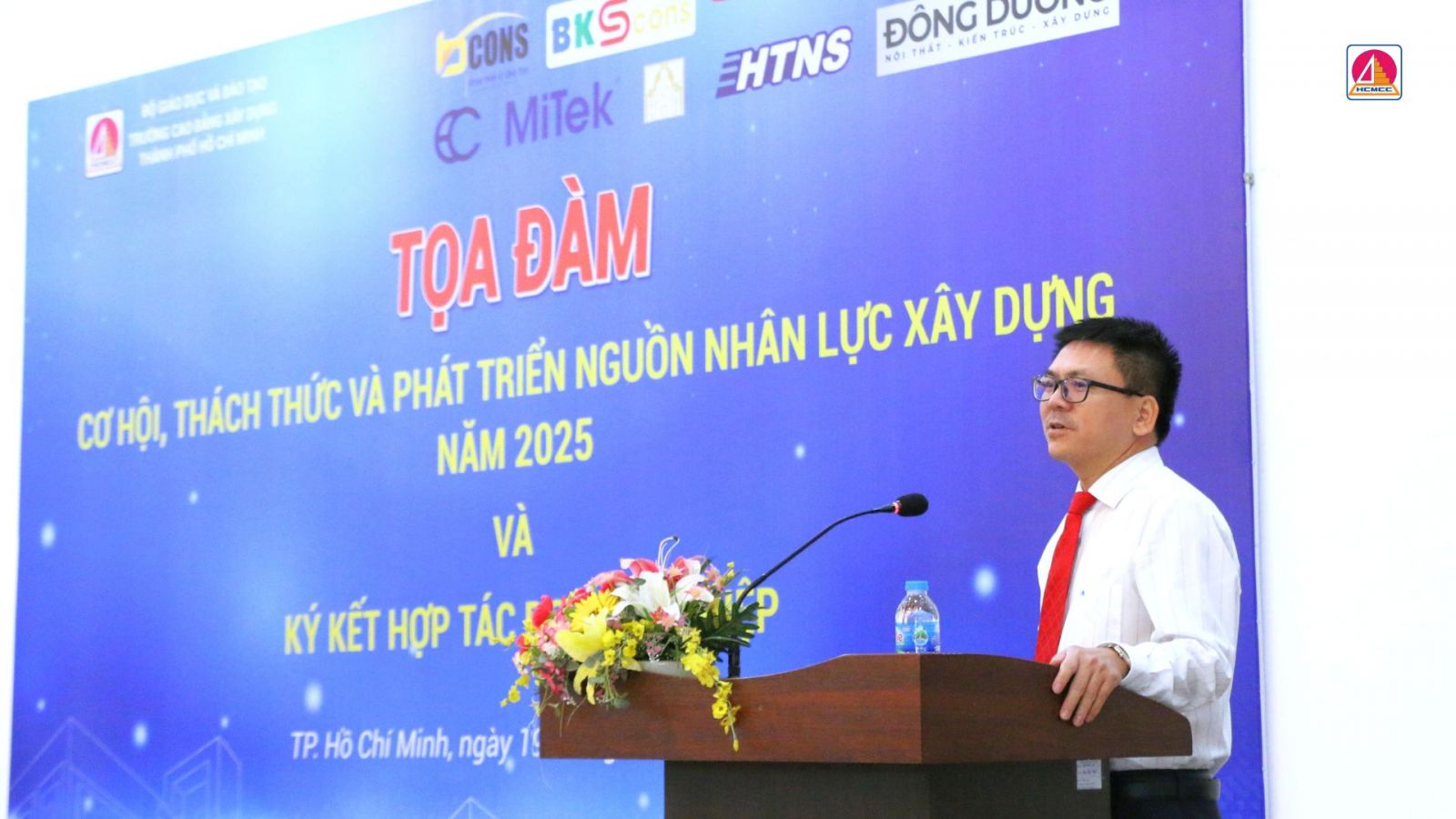 Trong phần phát biểu khai mạc, Thầy Nguyễn Bá Khiêm – Hiệu trưởng Nhà trường – đã nhấn mạnh vai trò quan trọng của mối liên kết giữa nhà trường và doanh nghiệp. Theo thầy, trong bối cảnh thị trường lao động ngành xây dựng biến động mạnh mẽ, việc tổ chức tọa đàm nhằm tạo điều kiện để sinh viên nắm bắt thông tin tuyển dụng, yêu cầu thực tiễn từ doanh nghiệp. Từ đó, sinh viên có thể tự định hướng việc học, trau dồi kiến thức và kỹ năng mềm, sẵn sàng đáp ứng nhu cầu lao động sau khi tốt nghiệp. Đồng thời, Thầy cũng gửi gắm niềm tin rằng những chia sẻ của doanh nghiệp sẽ trở thành động lực để sinh viên nuôi dưỡng khát vọng, hình thành thái độ học tập nghiêm túc và tinh thần làm việc chuyên nghiệp.